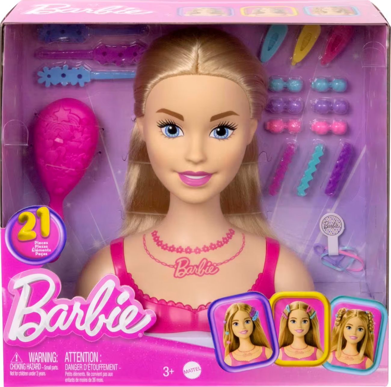 Includes 1 Barbie doll styling head, 1 hairbrush, 9 barrettes, 6 hair beads and 4 hair ties. Colours and decorations may vary.