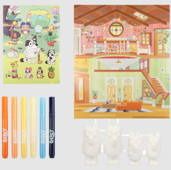 This exciting pack includes 4 squishy Bluey characters ready to be coloured and brought to life. With 6 vibrant markers, a sticker sheet, and a card scene, kids can customise their favourite characters and create their own Bluey adventures.